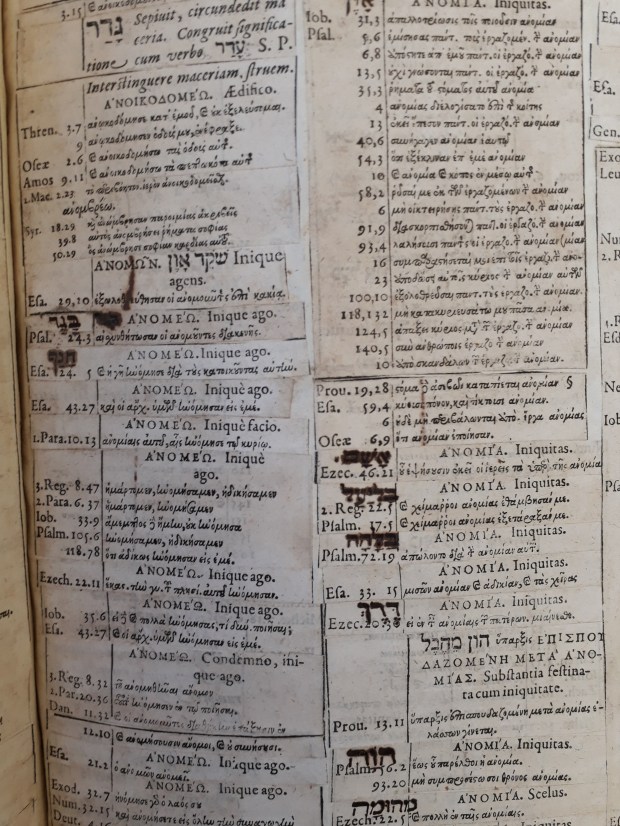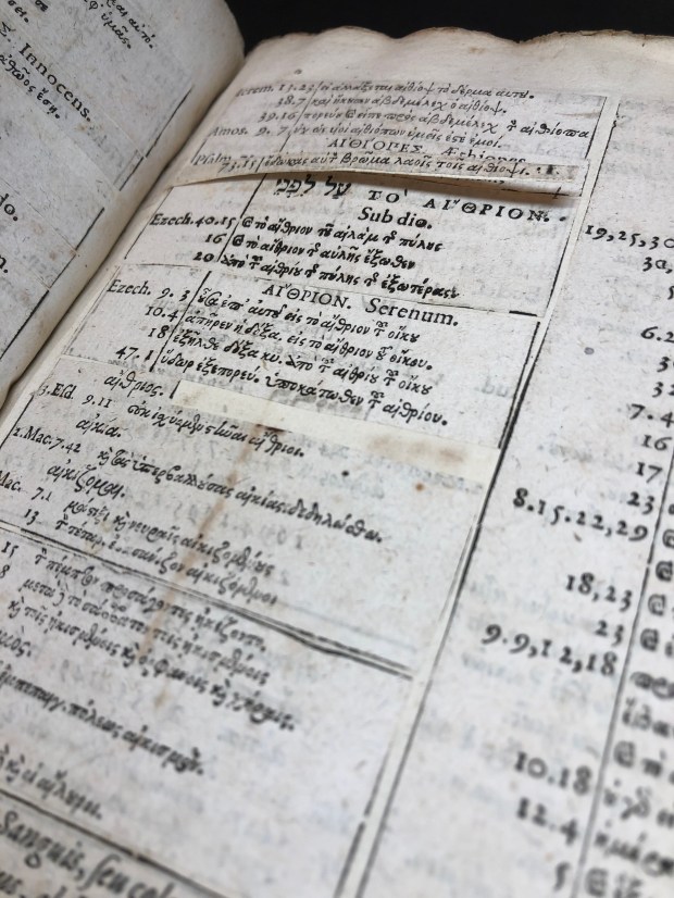 I’m pleased to have my own contribution in the volume as well. Interestingly, my article is positioned almost precisely at the end of this massive tome. But hey, I don’t actually blame anyone. The article is something of a black sheep, entitled “The ‘Scissors and Paste’ Septuagint Concordance in the Bodleian Library (Auct. E 1.2,3).” This was an article that was prompted by a very unlikely event: Reading the preface to the revised edition of Hatch and Redpath’s Concordance.*