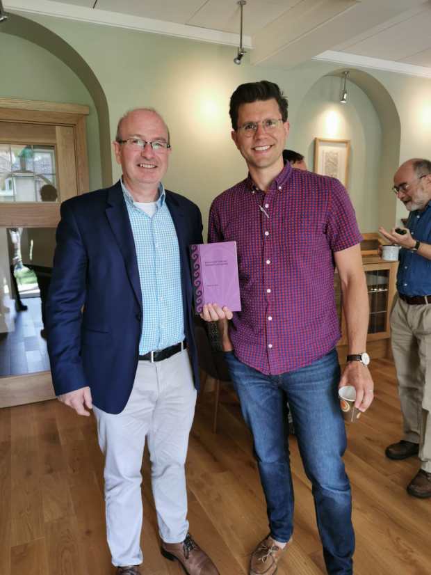 Perhaps the most enjoyable part of seeing the thesis through to publication was getting to present a copy of it to Jim, and to donate another copy to the Tyndale House library, where a great deal of the research and writing was done. You can see in the picture to the left that those two occasions actually coincided while I was in Cambridge last month. (As a side note, I am told that my shirt that day matches the book cover but please understand that such things are beyond my ability to coordinate.)