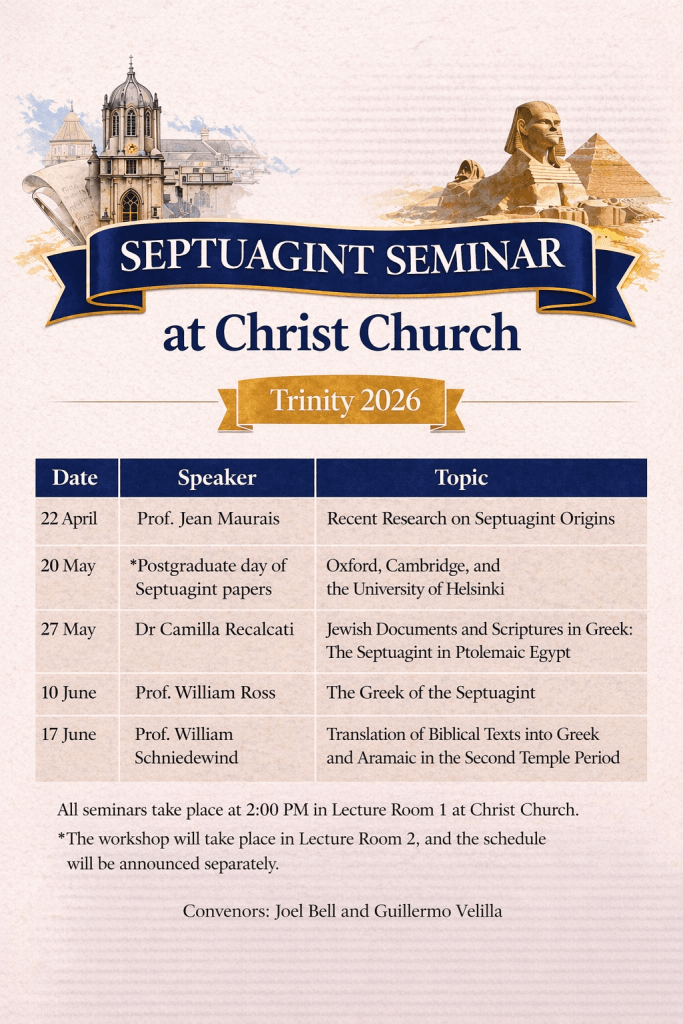 I’m happy to publicize information for the new Trinity term schedule for the Septuagint Seminar at Christ Church, Oxford. As you can see in the schedule below, there are a handful of seminars on the roster (including one by yours truly). I’ll post links here as they become available. But the very first one of the term is tomorrow. Info below: