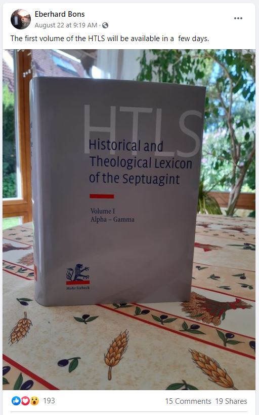 Wonderful news for biblical scholars everywhere: The first volume of the Historical and Theological Lexicon of the Septuagint (HTLS) is now available from Mohr Siebeck! Check out the picture of this beauty, sitting on the kitchen table of the editor, Eberhard Bons.
