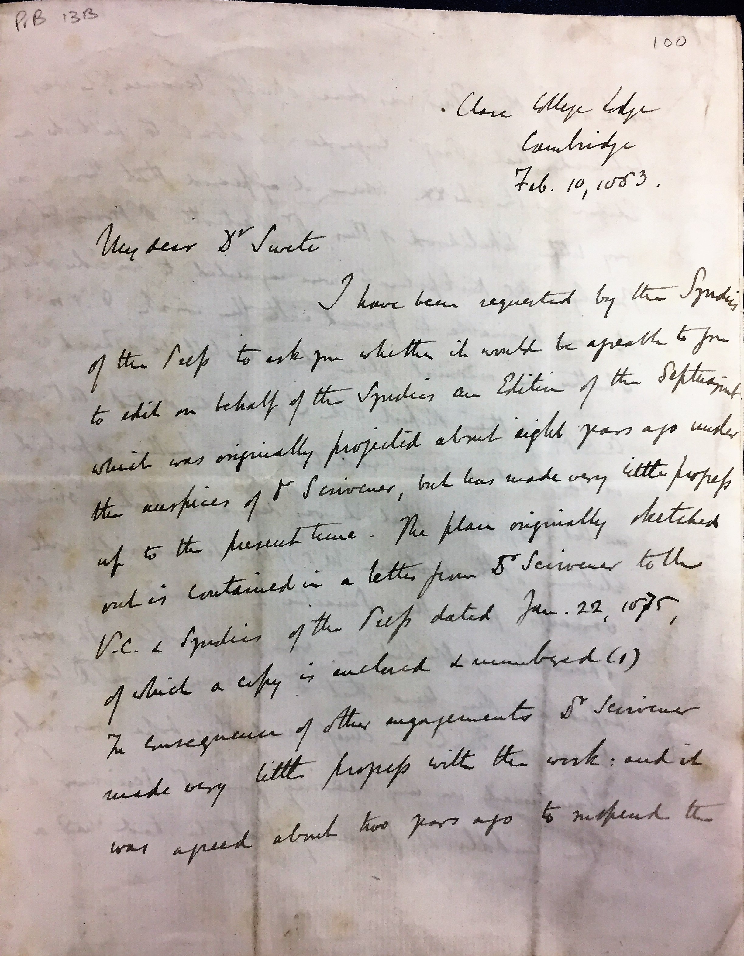 I have been requested by the Syndics | of the CUP to ask you whether it would be appealing to you | to edit on behalf of the Syndics an Edition of the Septuagint | which was originally projected about eight years ago under | the auspices of Dr Scrivener, but has made very little progress | up to the present time. The plan originally sketched | out is contained in a letter from Dr Scrivener to the | V. C. & Syndics of the CUP dated Jan. 22, 1875, | of which a copy is enclosed & numbered (1). | In consequence of other engagements Dr Scrivener | made very little progress with the work: and it | was agreed about two years ago to suspend the